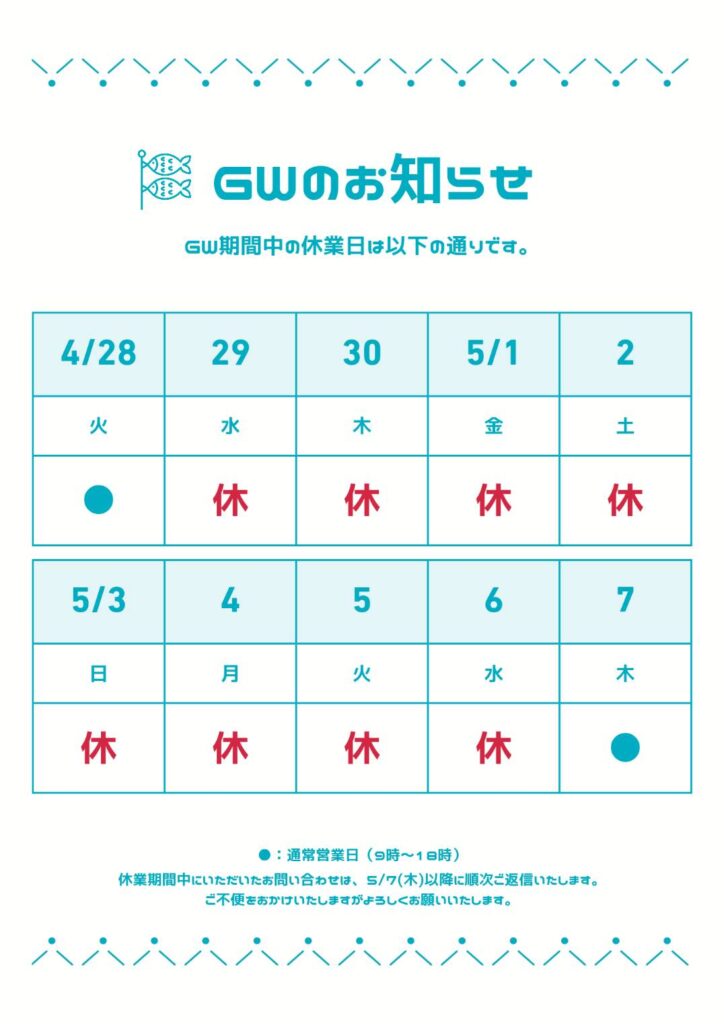 2026年4月29日から5月6日までお休みをいただきます。