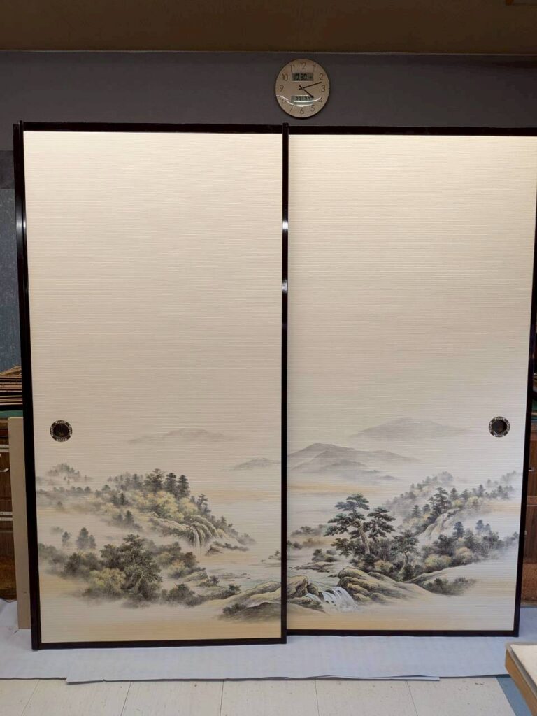 水墨画風のカッコいいこちらの襖。 近江913という紙で、2枚1組になっています。 このように左右の柄がつながるように張ると、 大きな一枚絵のような仕上がりになるのが魅力です('ω')ノ #愛知県 #三河 #刈谷市 #ふすま #襖 #障子 #網戸 #建具 #畳 ... -