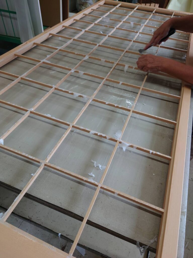 引き続き、障子を張替えまくってます。 木枠にやすりをかけ、 糊付けをして、 へらを使ってカッターで真っすぐ切っていきます。 説明は簡単でも、「上手に」貼れるようになるには時間が必要な作業です(>_<) -